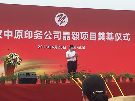 東西湖臺(tái)商投資區(qū)主任代表東西區(qū)各級(jí)領(lǐng)導(dǎo)發(fā)表重要講話,對(duì)武漢中原印務(wù)公司晶毅項(xiàng)目在此舉行奠基表示最衷心的祝賀和寄予深切的厚望!