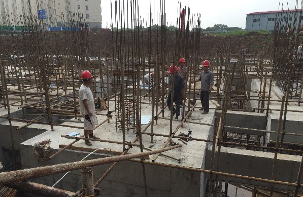 現(xiàn)場指揮部總指揮謝總工帶我們參觀了現(xiàn)場并大概介紹了各個(gè)棟號施工進(jìn)度等方面的情況。我們首先進(jìn)入16#樓施工現(xiàn)場,該棟號的項(xiàng)目經(jīng)理徐斌親自現(xiàn)場督促,施工現(xiàn)場緊鑼密鼓的進(jìn)行基礎(chǔ)承臺柱墻的鋼筋綁扎工作。剛剛完成的現(xiàn)澆混凝土承臺及承臺梁整體觀感好,整潔干凈、規(guī)范美觀。據(jù)謝總工介紹施工人員在混凝土澆筑時(shí),先攤平振搗密實(shí),然后用抹子抹平,緊接著再用掃帚在已抹好的面層上輕輕掃一遍,再用薄膜覆蓋住才能達(dá)到好的效果。承臺上正在綁扎鋼筋的墻柱,每個(gè)樣板上都張貼著相應(yīng)的構(gòu)件尺寸及鋼筋信息,便于檢查核對和施工操作,體現(xiàn)出該工程現(xiàn)場施工人員嚴(yán)謹(jǐn)認(rèn)真的工作態(tài)度。