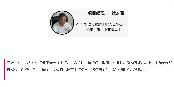 南湖小學(xué)項(xiàng)目是事關(guān)教育百年大計(jì)的重要民生工程,開工以來不僅受到各級(jí)政府領(lǐng)導(dǎo)的熱切關(guān)注,也受到集團(tuán)領(lǐng)導(dǎo)的高度重視,自承接項(xiàng)目伊始,項(xiàng)目經(jīng)理徐家富就承諾:一定要把南湖小學(xué)項(xiàng)目做成集團(tuán)的樣本工程,創(chuàng)杯工程,讓社會(huì)和政府滿意的工程!短短三個(gè)月的時(shí)間,南湖小學(xué)項(xiàng)目就取得了不少成就,不僅受到政府各級(jí)領(lǐng)導(dǎo)的表揚(yáng),也榮獲了集團(tuán)各職能部門的一致好評(píng),更讓他的承諾成功轉(zhuǎn)化為現(xiàn)實(shí)!