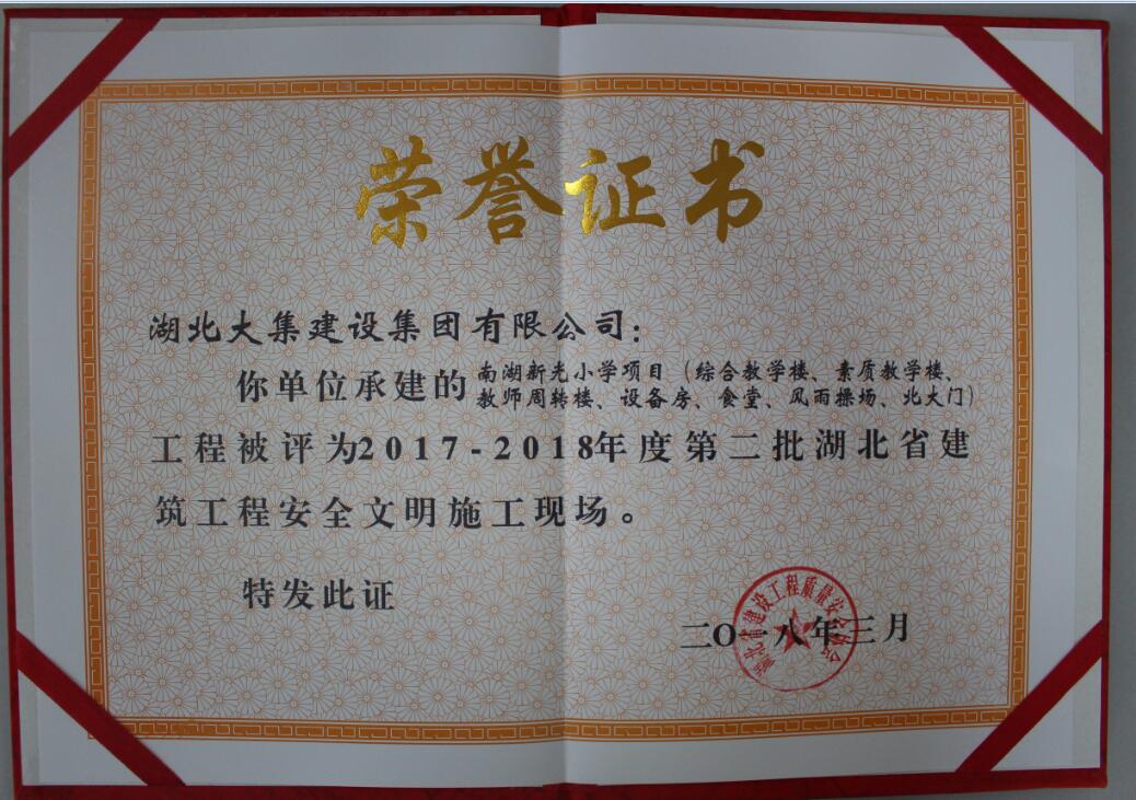 南湖新光小學(xué)項(xiàng)目(綜合教學(xué)樓、素質(zhì)教學(xué)樓、教師周轉(zhuǎn)樓、設(shè)備房、食堂、風(fēng)雨操場、北大門)工程被評(píng)為2017-2018年度第二批湖北省建筑安全文明施工現(xiàn)場(楚天杯);綜合教學(xué)樓工程被評(píng)為2016-2017年度第四批湖北省建筑結(jié)構(gòu)優(yōu)質(zhì)工程!