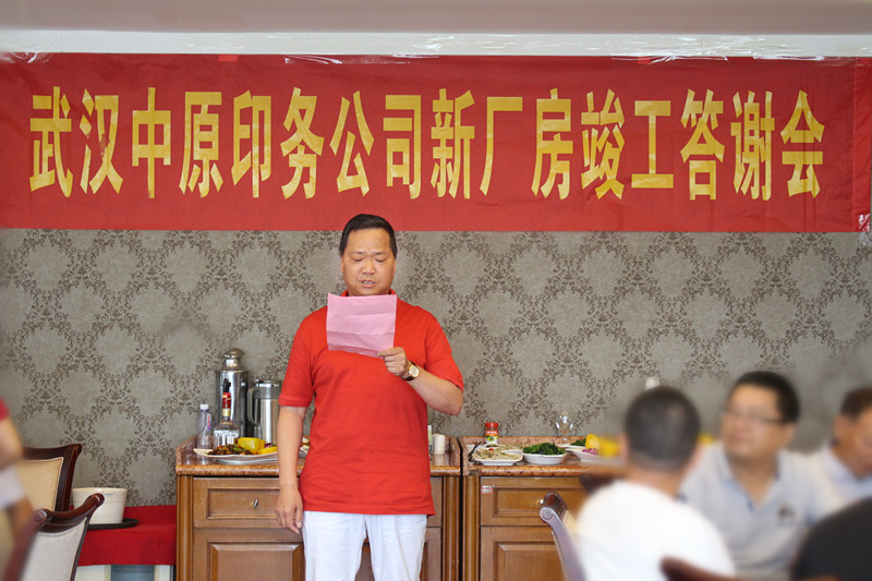 6月26日,武漢中原印務有限責任公司隆重舉行新廠房竣工答謝會,集團副總經理徐家富、項目經理田建新、招投標部部長胡鵬、財務部部長鄧雪芬等受邀出席。