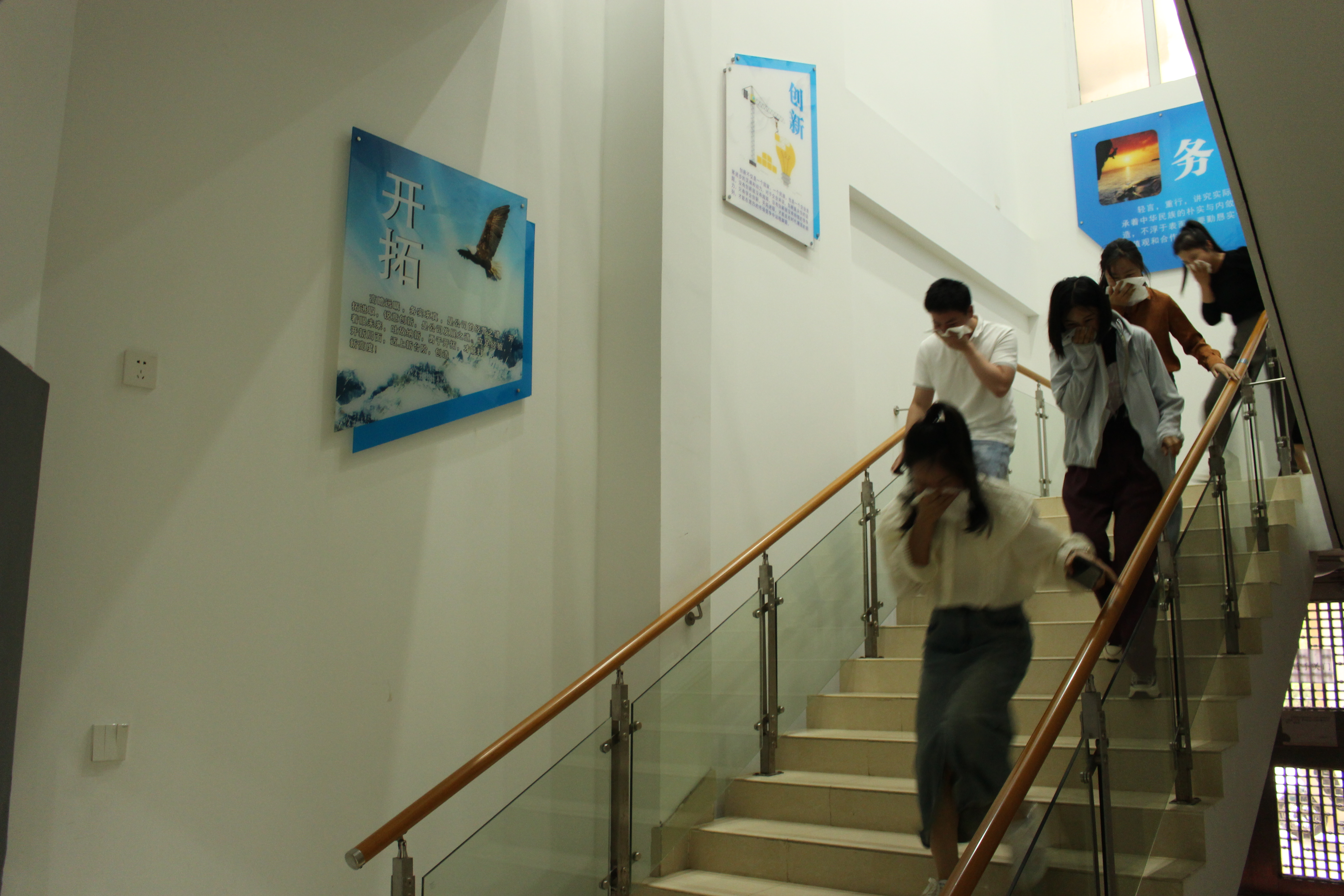 在火災(zāi)發(fā)生逃生演習(xí)中,隨著一聲“著火了”,全體人員用毛巾捂住口鼻、彎腰前行,按照逃生路線有序撤離,安全抵達(dá)指定緊急集合點(diǎn)。