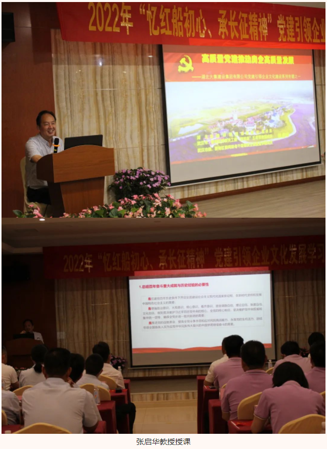 接著,湖北省委講師團基層理論宣講員張啟華教授以“高質(zhì)量黨建推動企業(yè)高質(zhì)量發(fā)展”為主題進行授課。張教授從“苦難與輝煌”、“消失與崛起”、“巨變與挑戰(zhàn)”、“經(jīng)驗與啟示”、“輝煌與蝶變”五個方面分別講述了中國共產(chǎn)黨的百年奮斗史、跌宕起伏中國房企十年之變、房企掌舵者眼中的2022年、紐約灣區(qū)發(fā)展成為世界級灣區(qū)的原因以及高科技贏在新時代的內(nèi)容,并在講解中融入了湖北大集建設(shè)集團和武漢閱景匯兩家公司的發(fā)展歷程,讓大家對中國共產(chǎn)黨的發(fā)展、公司的發(fā)展以及個人的發(fā)展有了更加清晰的認識以及深刻的反思。