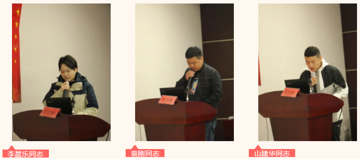 大會第一項議程,討論并確定發(fā)展對象和入黨積極分子。大會嚴格按照黨員發(fā)展流程,入黨申請人李晨樂同志、袁剛同志匯報了入黨動機、對黨的認識,入黨積極分子山建華同志宣讀了《入黨志愿書》,匯報了其在工作學習方面的表現(xiàn)。隨后,經過支部黨員們研究討論、投票表決,最終確定山建華同志為發(fā)展對象,李晨樂、袁剛兩名同志為入黨積極分子。