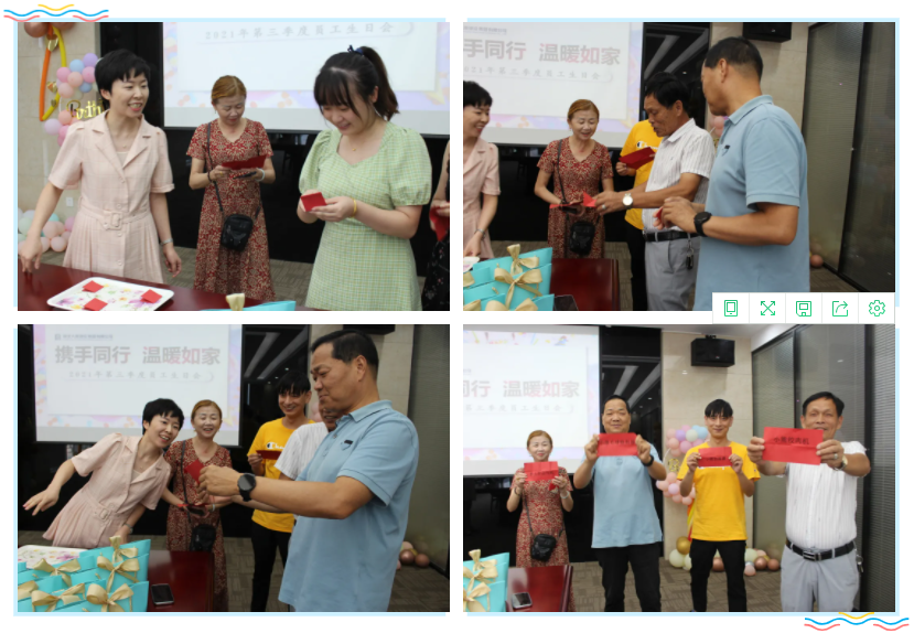 九月,秋高氣爽,碩果累累,秋日的微風(fēng)和陽光是如此的美好。成長不期而遇,生日如約而至。在精心布置的會(huì)議室里,輕快的音樂聲相隨,大屏幕上播放著美好的生日祝福,集團(tuán)公司為第三季度生日的員工舉辦了小小的生日Party。氣球、生日蛋糕、禮物、精致月餅、琳瑯滿目的零食飲品,每一處溫馨的細(xì)節(jié),都承載著公司對員工的愛與關(guān)懷。